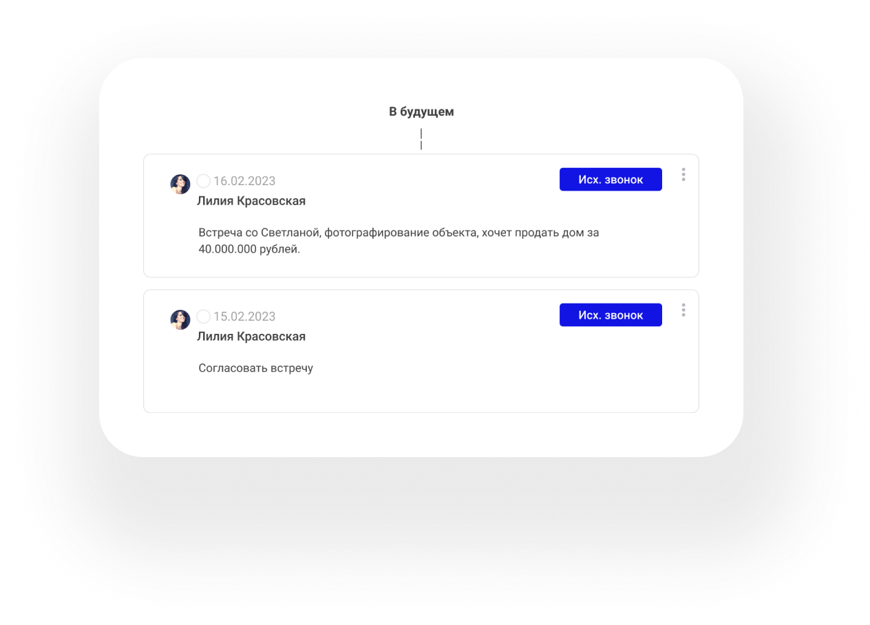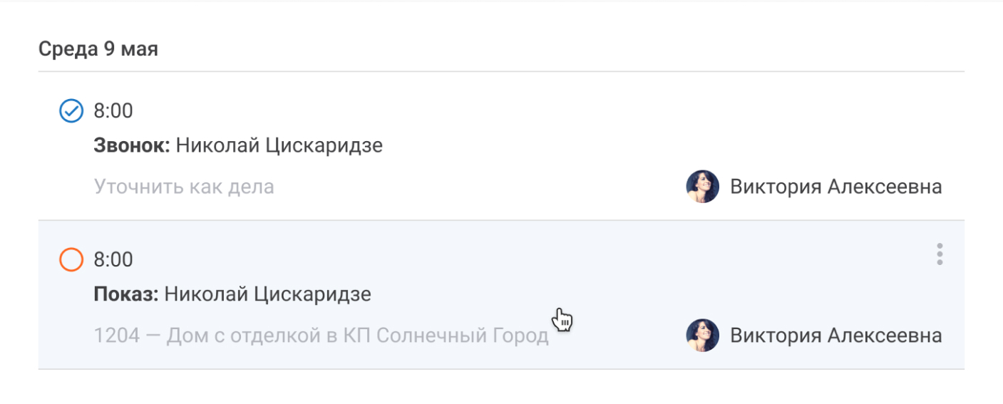Добавляйте запланированные звонки и просмотры объектов недвижимости в рабочий календарь.
