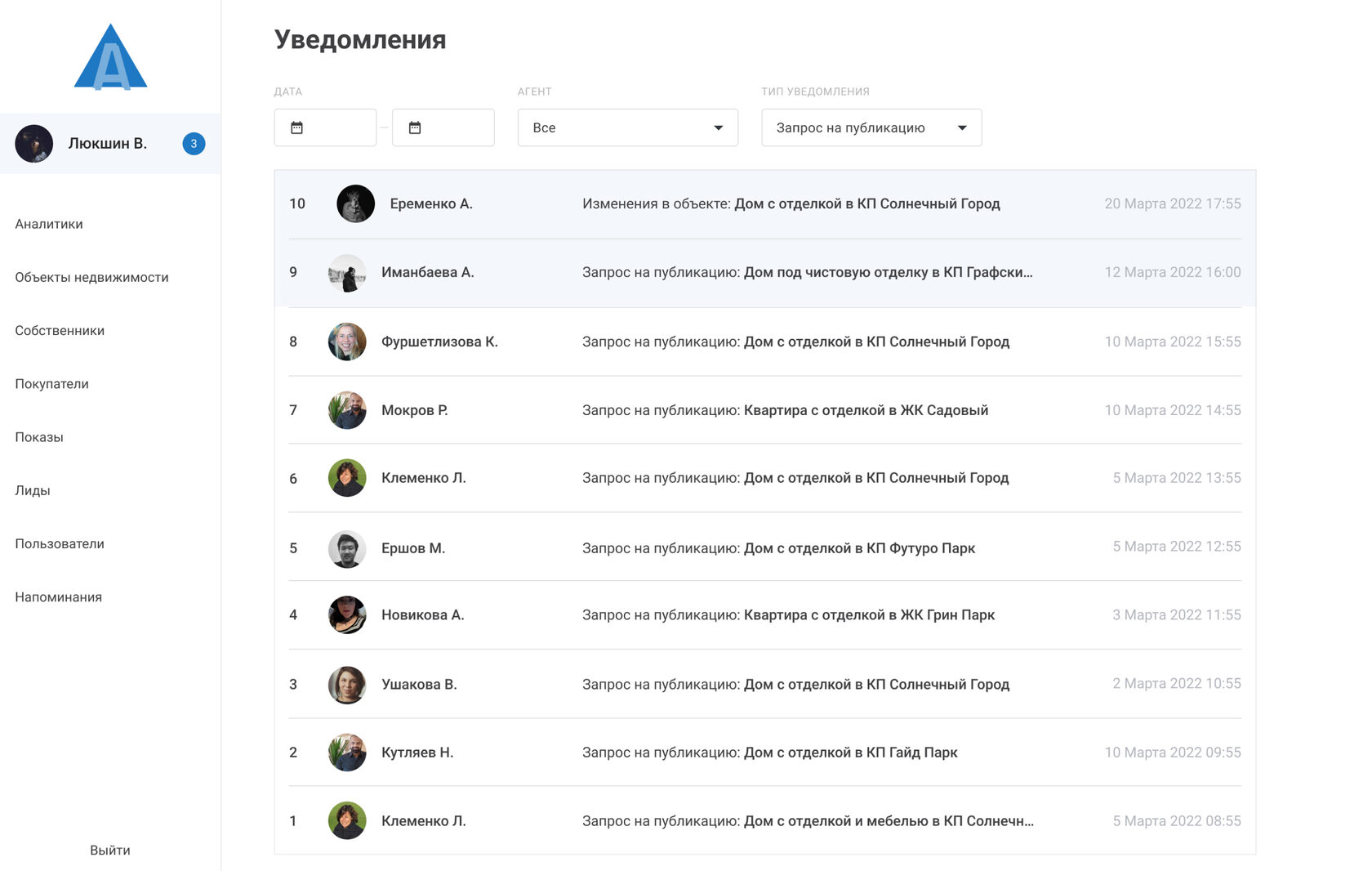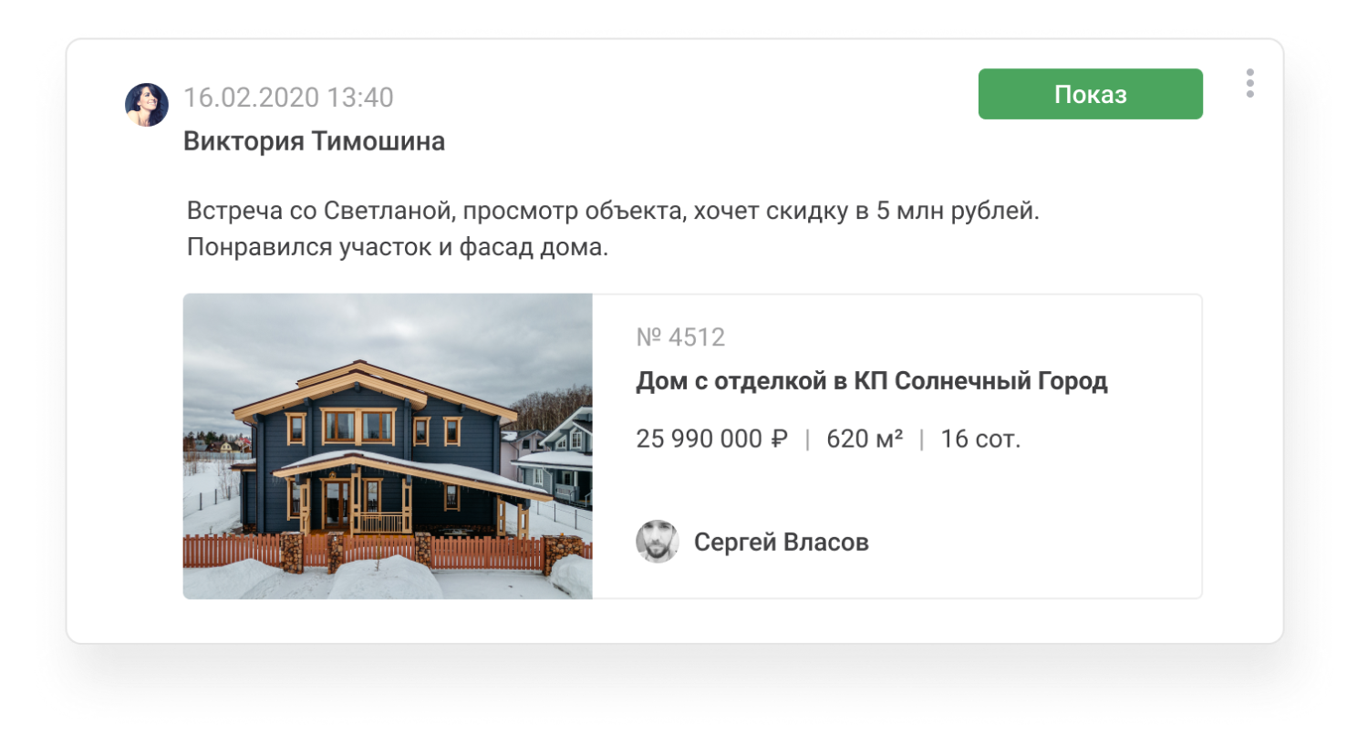 История всех взаимодействий агента и собственника объекта: звонки, просмотры объектов, комментарии.
