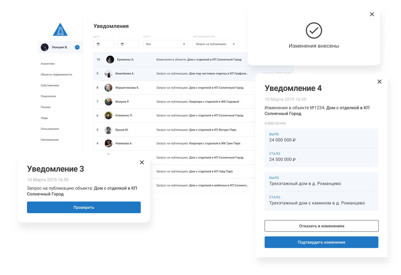 Настройте отправку оповещений для собственников: изменение цены, редактировании описания, запланированные показы объекта.